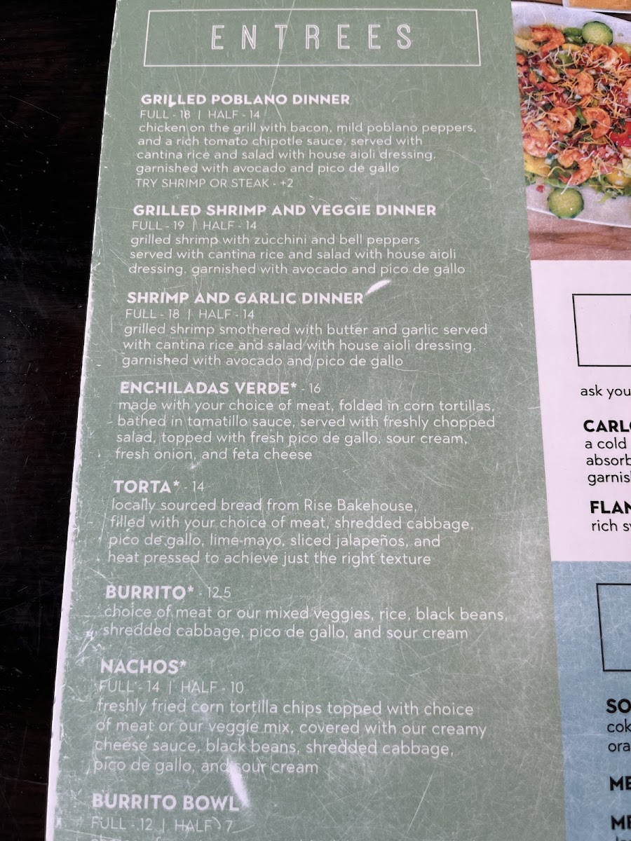 Taco lovers will appreciate the variety of options, including Al Pastor Taco, Grilled Chicken Taco, Fish Taco, and Grilled Veggie Taco. For a more substantial meal, there are options like the Shrimp and Veggie Dinner, Enchiladas Verdes, and Grilled Poblano Dinner. If you prefer handheld meals, the Shrimp Torta or the classic Shredded Chicken Torta will surely satisfy.