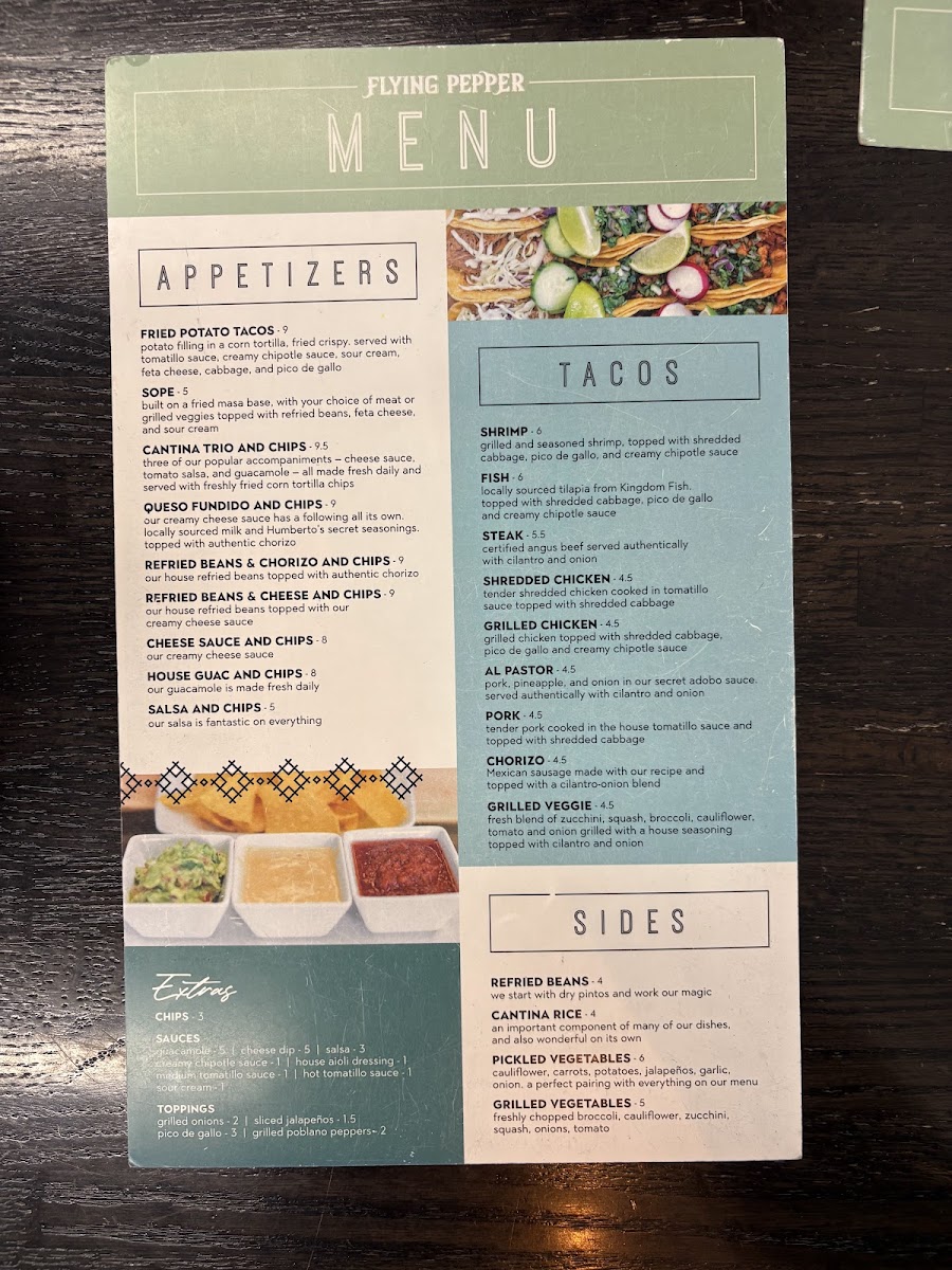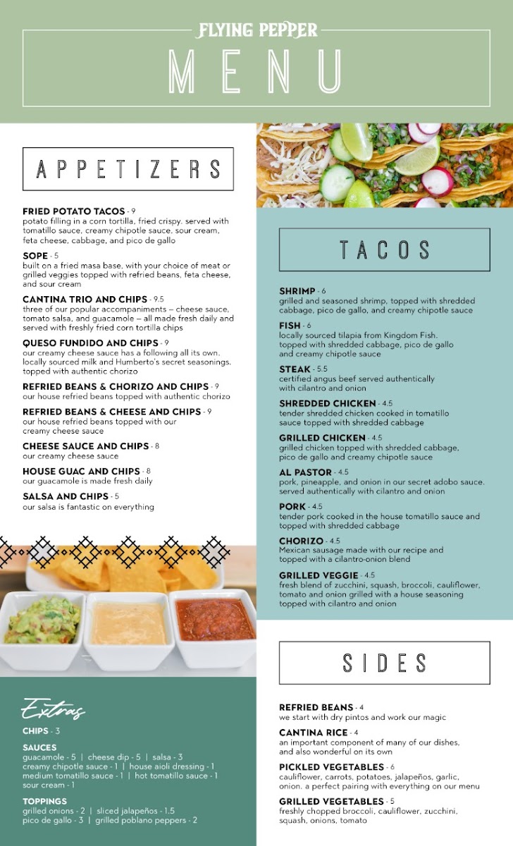 The menu at The Flying Pepper Cantina offers a delightful variety of Mexican-inspired dishes, perfect for satisfying a range of cravings. Whether you're coming in for a casual snack or a hearty meal, there’s something for everyone. If you're planning a group gathering, the Taco Box is a great choice, offering a generous amount of tacos to share. For appetizers, the Cantina Trio and Queso Fundido are favorites, while the Guacamole and Chips and Salsa and Chips provide a perfect start to any meal.